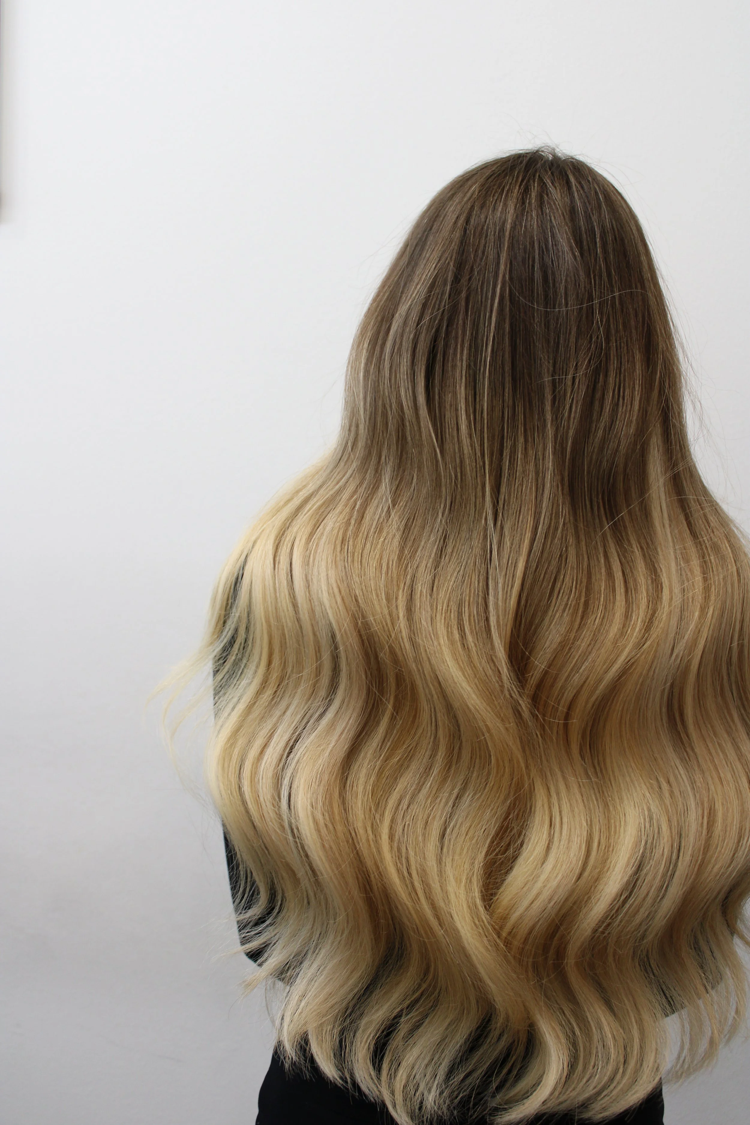Side profile of a woman with long, wavy blonde hair against a plain white background.